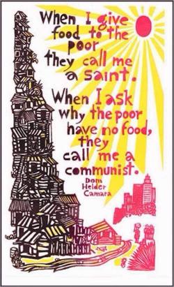 11" x 17" • Text reads: "When I Give Food To The Poor They Call Me A Saint. When I Ask Why The Poor Have No Food, They Call Me A Communist." Design by Ricardo Levins Morales. Quote by Dom Helder Camara, Brazilian liberation theologist. Northland Poster Collective.